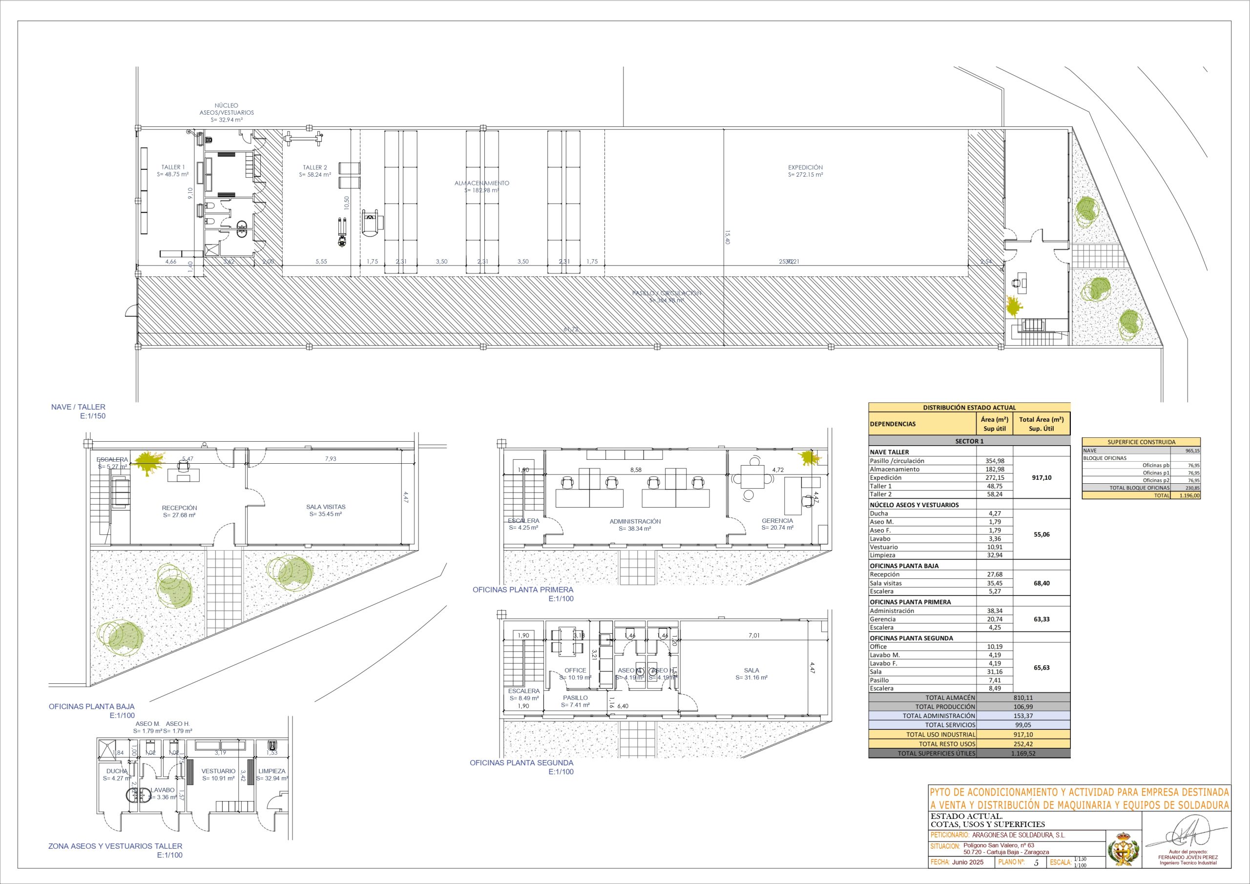 Datos: Acondicionamiento de local de 1.196,00 m² de Superficie Construida destinados a nave Taller, Núcleo aseos y vestuarios y bloque de oficinas, dividida en planta baja, primera y segunda.