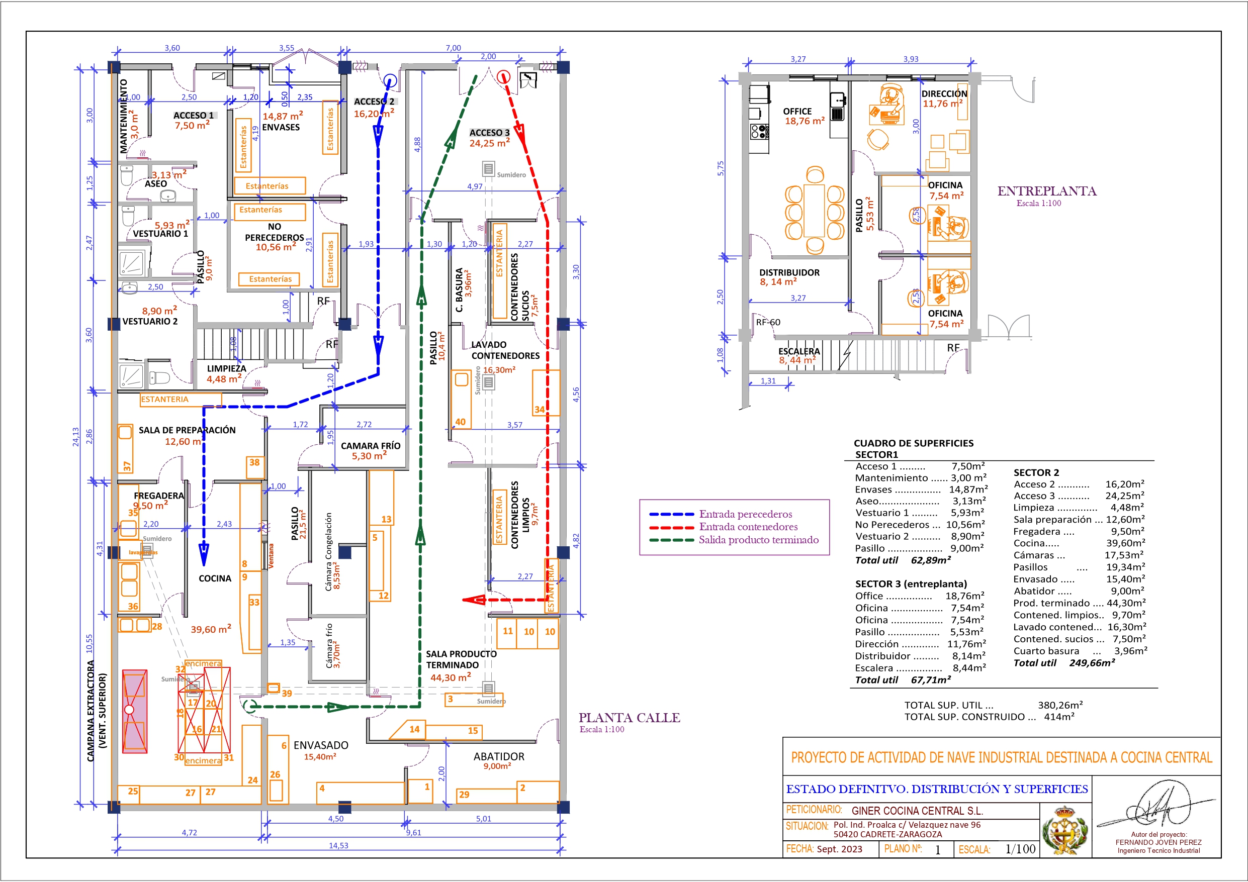 Datos: Puesta en marcha de COCINA CENTRAL, con separación de materia prima y producto acabado, cocina, zona fría, cámaras, zonas de uso administrativo, aseos y vestuarios, con una superficie construida total 414,00 m².