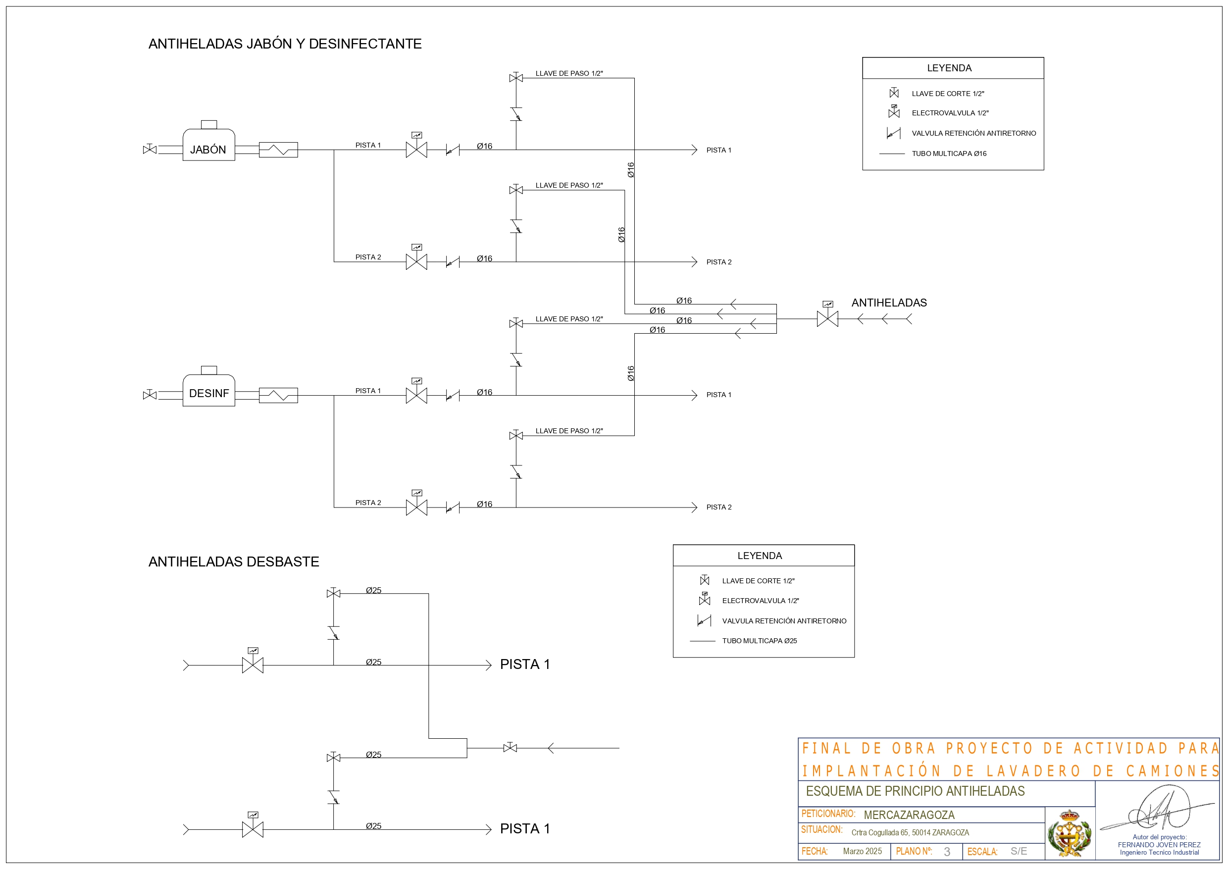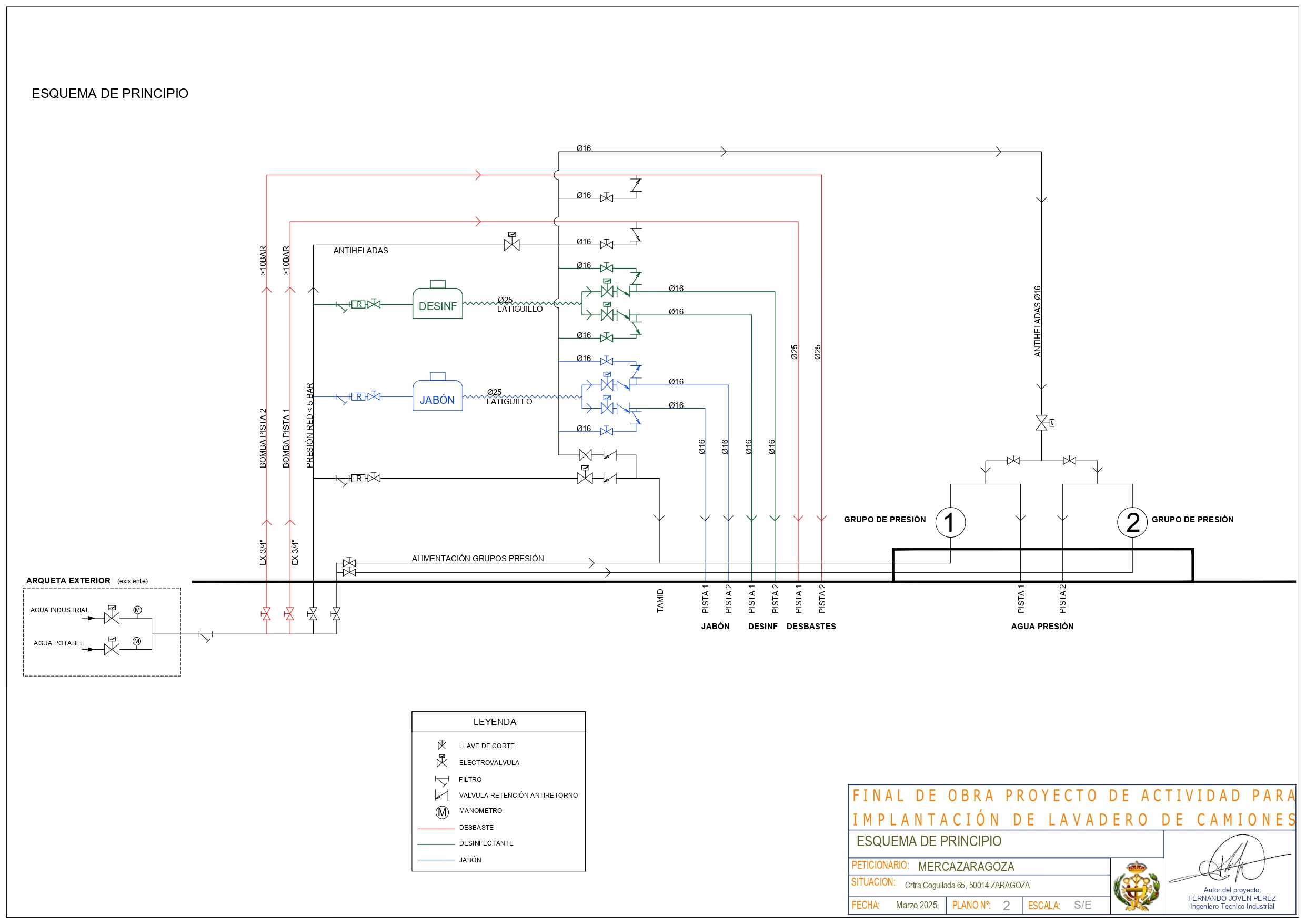 Datos: Actuación para la ejecución de un centro de lavado y desinfección para camiones dentro del complejo MERCAZARAGOZA, con la ejecución de una nueva caseta de bpombas y maquinaria, introducción de un sistema de lavado con detergente y desinfección respectivamente, tanto con mangueras auto enrollables como con lanzas de presión y sistema de desinfección de bajos respectivamente, así como la implantación de un sistema de pago y control de los procesos realizados en cada camión.